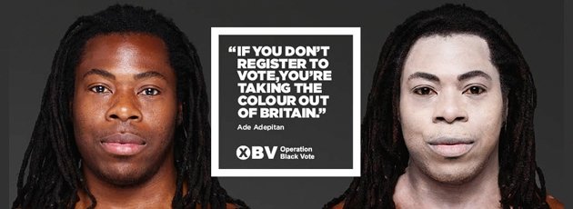 Reversing the deeply offensive “Al Jolson” style Black face tradition, the campaign is a powerful metaphor that “if you don’t register to vote and vote you drain the colour from all of our British institutions.” By not voting, we ensure we are not properly represented in Parliament or in any corridors of power.
